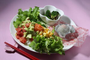 ブロッコリー、卵、アボカド、トマトを彩りよく並べ、最後にスモークサーモンのバラを飾ります。
