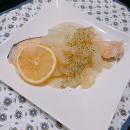 ④ 鮭を皿に盛り付け、フライパンに残った玉ねぎと蒸し汁を軽く煮詰めて味を整え、鮭にかける。